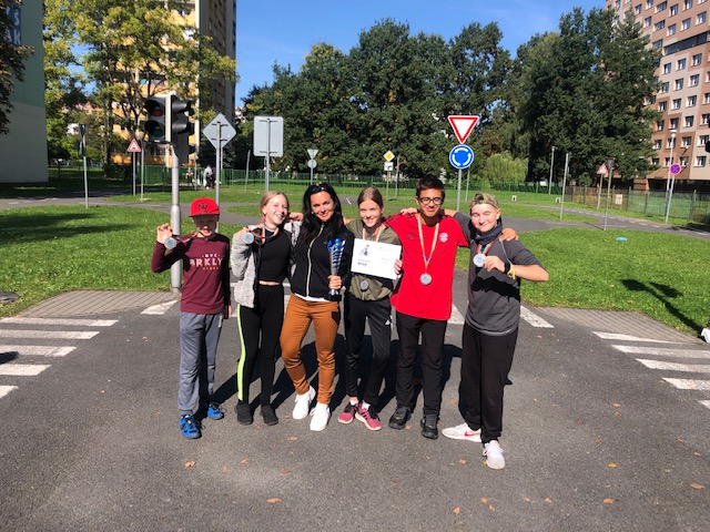 Minulý týden v pátek 1.10.2021 se konala na hřišti ZŠ A. Kučery v Hrabůvce Dopravní soutěž mladých cyklistů 2021. Naši školu reprezentovalo 5 žáků ze 7.B – Terezka Camfrlová, Eva Alagičová, Natálka Lisková, Radim Romaniec a Lukáš Geffert. Dovezli si medaile a pro školu stříbrný pohár za úžasné 2. místo!